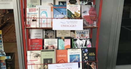 Duecento volumi all'esterno della Libreria del tempo messi a disposizione per questi giorni "casalinghi"