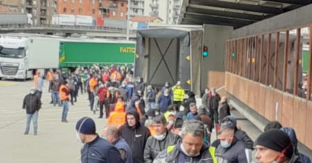CHIASSO - Una coda a perdita d'occhio. Allungata dalle distanze di sicurezza - obbligatorie - tra le persone in fila. Una folla di camionisti era visibile questa mattina nel piazzale davanti al Padiglione commerciale del valico di Chiasso-Brogeda, in attesa di sbrigare le pratiche d'import-export.