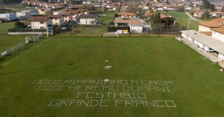 Sul campo da calcio la scritta: "Rimaniamo a casa"