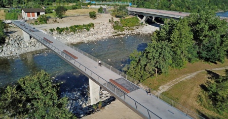 Il costo e i numeri - L’opera, dal costo di circa 5,6 milioni di franchi, figura fra le misure del Programma di agglomerato del Locarnese di seconda generazione (PALoc2) finanziata dal Cantone con 2,3 milioni dai comuni della regione (CIT) con 1,2 milioni, con un sussidio da parte della Confederazione pari a ca. 2,1 milioni. Il nuovo manufatto, della lunghezza complessiva di 161 metri, si sviluppa su quattro campate. La struttura è in acciaio, il calpestio è rifinito in resina epossidica con aggiunta di granulati di quarzo(antisdrucciolo) e degli inserti puntuali in lastre di granito. La posa di panchine lungo la struttura permette di definire con agio la fruibilità degli spazi riservati fra pedoni e ciclisti . La larghezza utile varia da 5 a 5.5 metri con una pendenza ridotta (fino al 4% del camminamento). L’illuminazione è garantita da un impianto a LED. Completano l’opera le rampe di accesso al manufatto che con pendenze sempre contenute, praticabili anche da persone diversamente abili, garantiscono il collegamento alla rete ciclabile regionale nonché alle piste d’argine e golene fluviali.
