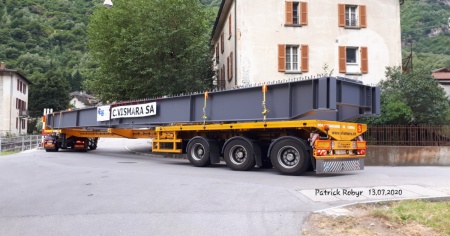 PERSONICO - Trasporto eccezionale consegnato e posato lunedì mattina a Personico. Grazie all'intervento di un autoarticolato speciale e di un'autogru, il nuovo ponte sul riale Rierna è giunto a destinazione.