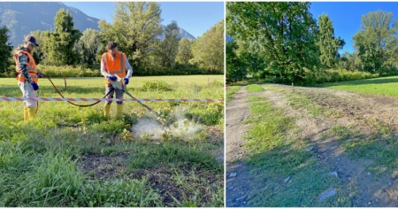 Per combattere questo nemico piuttosto indiscreto, il Dipartimento del territorio ha svolto un'azione dimostrativa sul piano di Magadino. Qui sono state messe in campo, nel vero senso del termine, due nuove tecniche di trattamento per estirpare la neofita. Metodi che, naturalmente, non impiegano prodotti fitosanitari, il cui utilizzo è stato vietato dall’Ordinanza concernente la riduzione dei rischi nell'utilizzazione di determinate sostanze, preparati e oggetti particolarmente pericolosi.