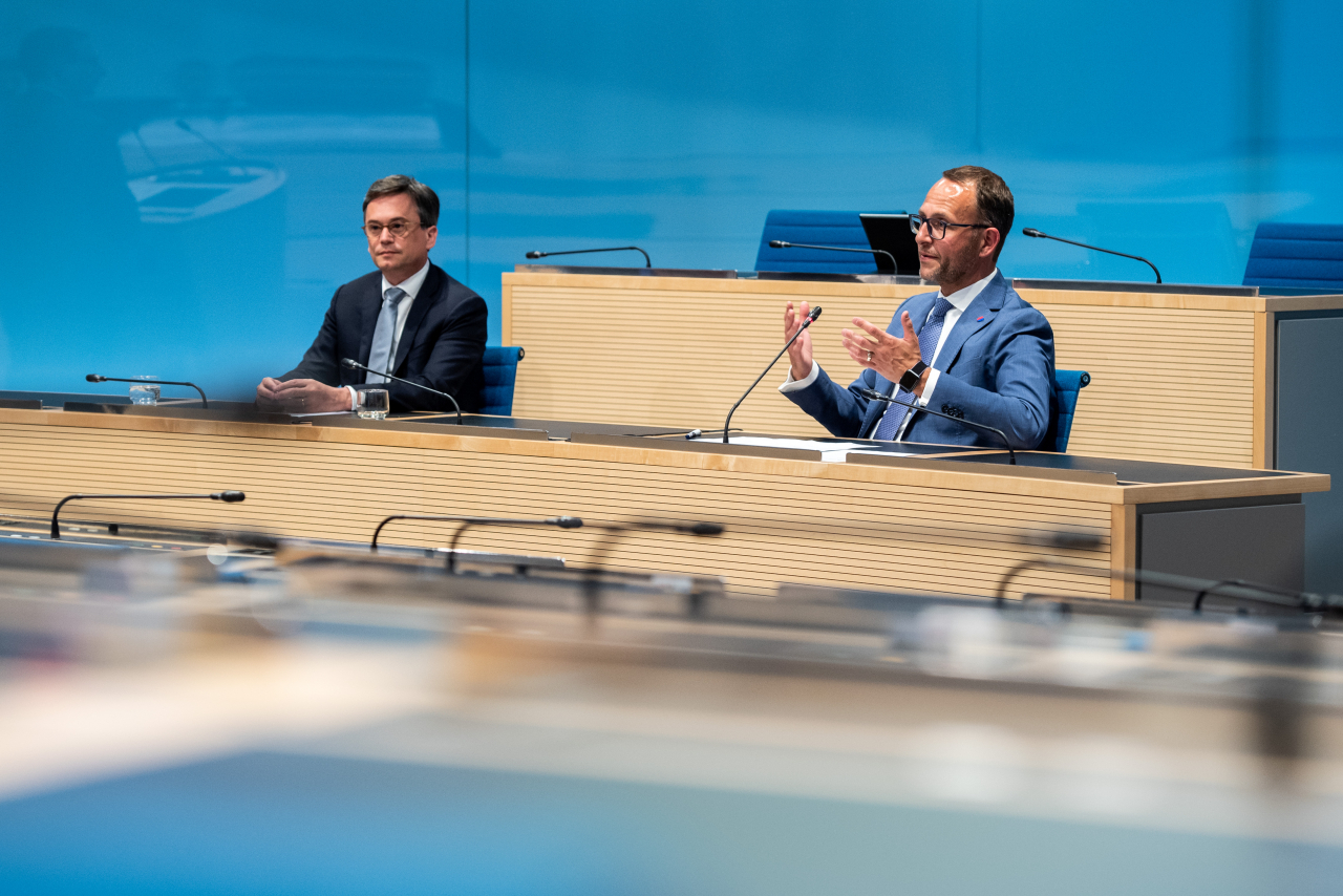 Nella sala stampa di Palazzo delle Orsoline a Bellinzona erano presenti tre membri dell'esecutivo: il Presidente del Governo Norman Gobbi, il direttore del Dipartimento sanità e socialità Raffaele De Rosa e quello del Dipartimento finanze ed economia Christian Vitta (per la prima volta in conferenza stampa dall'arrivo della seconda ondata).