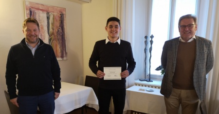 Il presidente di geosuisse sezione Ticino ing. Claudio Frapolli e il presidente degli Ingegneri Geometri Svizzeri (IGS) sezione Ticino ing. Riccardo Calastri hanno consegnato un premio di Fr. 500 al giovane apprendista.