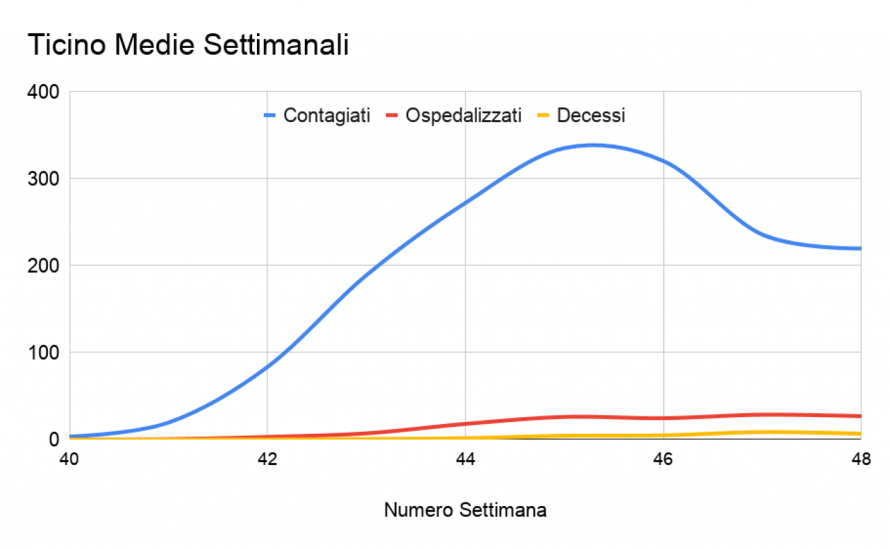 Confronti settimanali - Confrontando i dati settimanali, si può notare che la media dei contagi giornalieri su sette giorni è in calo. La prima settimana di novembre si sono registrati 335 positivi, questo numero è sceso a 320 la settimana successiva e a 236 in quella tra il 16 e il 22 novembre. Nella settimana appena trascorsa i casi positivi sono ancora lievemente calati e la media si è attestata a 220. In leggero calo anche i numeri riguardo agli ospedalizzati e ai decessi: i ricoveri (media su sette giorni) sono scesi da 29 a 27 nel confronto tra le ultime due settimane, mentre i decessi sono passati da 9 a 7 di media al giorno.