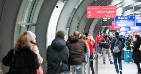 Carpendo e condividendo scampoli d'indicazioni, i presenti riescono a capire che devono fissare un test del coronavirus sul sito di Centogene, una società privata, per poi farsi fare il tampone in una stanza poco lontano. Se il risultato è negativo possono proseguire il viaggio.