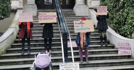 Le attiviste si sono schierate all'ingresso del tribunale, coprendosi il volto con dei cartelli di protesta. L'azione - si legge in un comunicato del gruppo femminista - vuole «esprimere solidarietà e vicinanza alla vittima e denunciare come sia ancora troppo difficile per le donne riuscire ad essere ascoltate, credute ed ottenere giustizia».