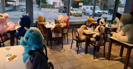 «Ieri si è aggiunto l’orso polare come guardia di vigilanza sul numero degli avventori. Abbiamo un tavolo da 5, uno da 3, uno da 4, uno da 2… Saranno in tutto una ventina di peluches. Ci hanno scritto che ne arriveranno ancora… Stiamo riscuotendo un gran successo».