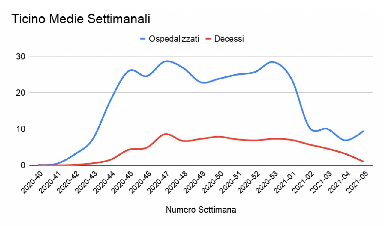 La curva dei pazienti ospedalizzati e dei decessi in Ticino.