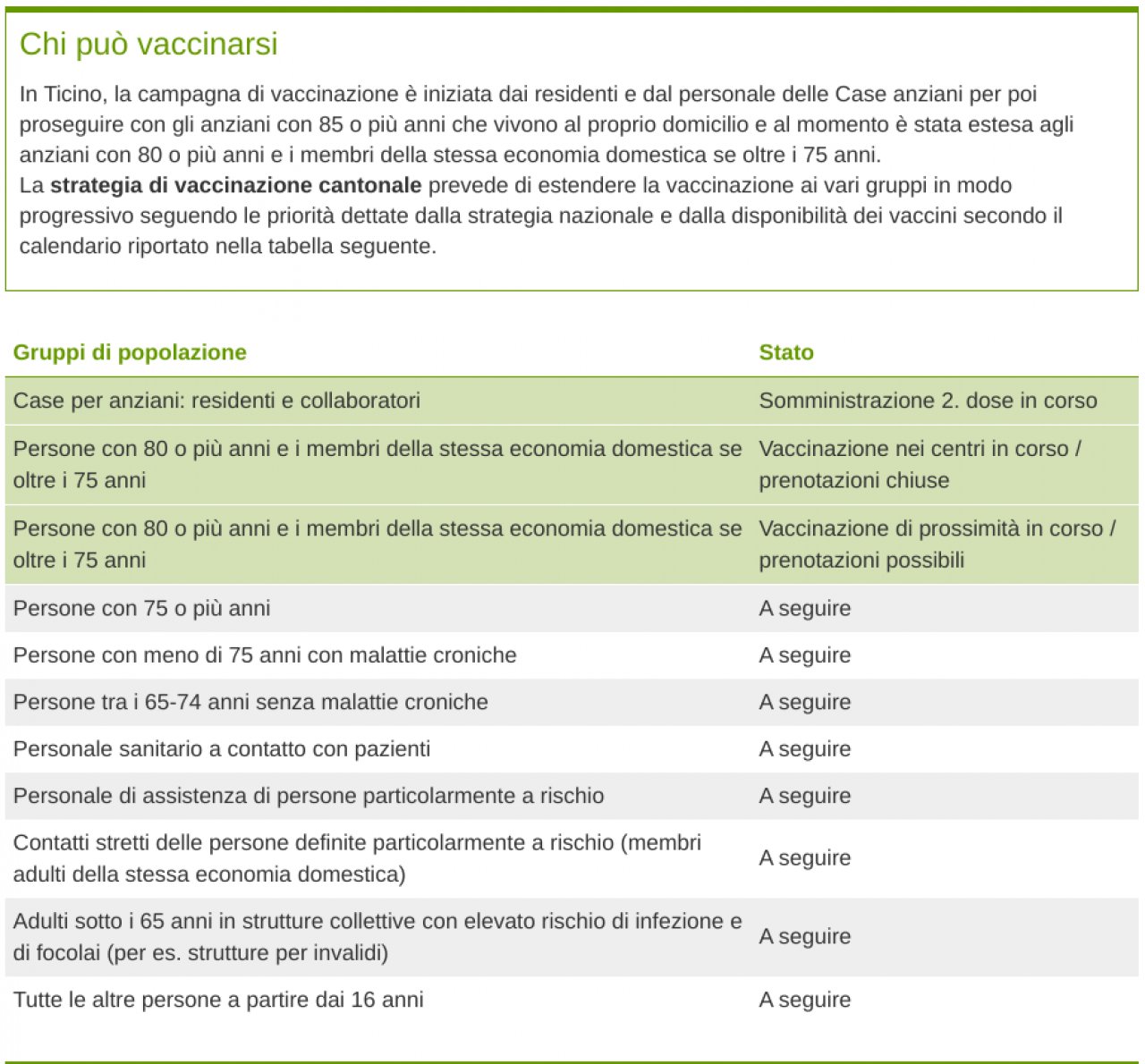Ma, come detto, l’attesa è ancora lunga. «È responsabilità dei cantoni definire i gruppi target e somministrare le dosi di vaccino disponibili alle persone più bisognose di protezione». E in Ticino siamo ancora fermi agli over 80 (e loro conviventi sopra ai 75 anni). I prossimi, stando all’attuale strategia (che potrebbe però subire modifiche), saranno gli over 75 e subito dopo chi è affetto da malattie croniche (senza limiti di età). Finora sono circa 30mila le dosi somministrate nel nostro cantone, fa sapere proprio oggi il Consiglio di Stato. «La scarsità di dosi a disposizione continua a influenzare la velocità della campagna vaccinale».