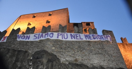 BELLINZONA - «Non siamo più nel medioevo». Uno striscione barricadero, poco galante e poco gentile, quello comparso questa sera tra le guglie di Castelgrande tra gli sguardi dei passanti.
