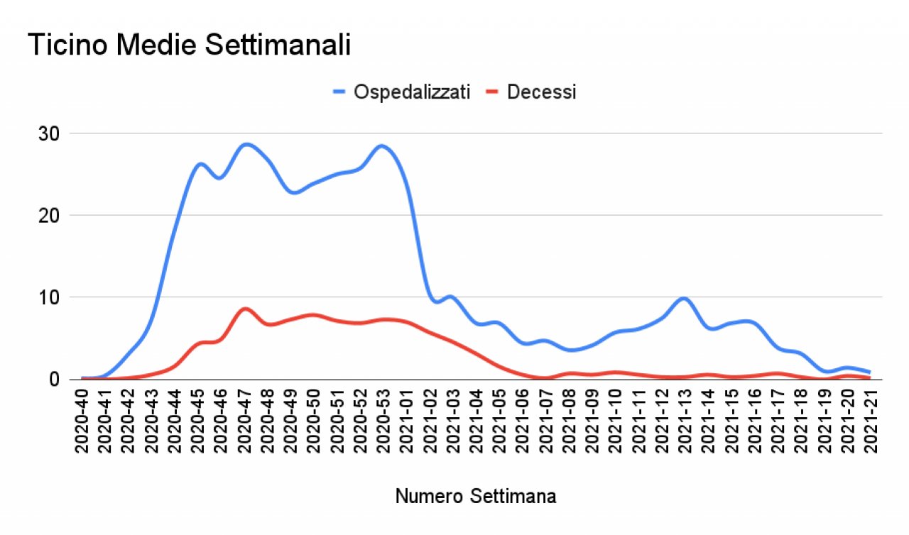 Immunizzato il 21,8% dei ticinesi - I dati riguardanti la campagna vaccinale, aggiornati al 26 maggio, riferiscono di un 21,7% della popolazione ticinese ora completamente immunizzato, e di un totale di 209'048 dosi inoculate. Il tasso di riproduzione Rt, riferito al 14 maggio, si attesta allo 0,68, ovvero ampiamente sotto la soglia critica dell'uno. Sono invece 69,42 le persone positive su centomila abitanti contabilizzate negli ultimi 14 giorni.