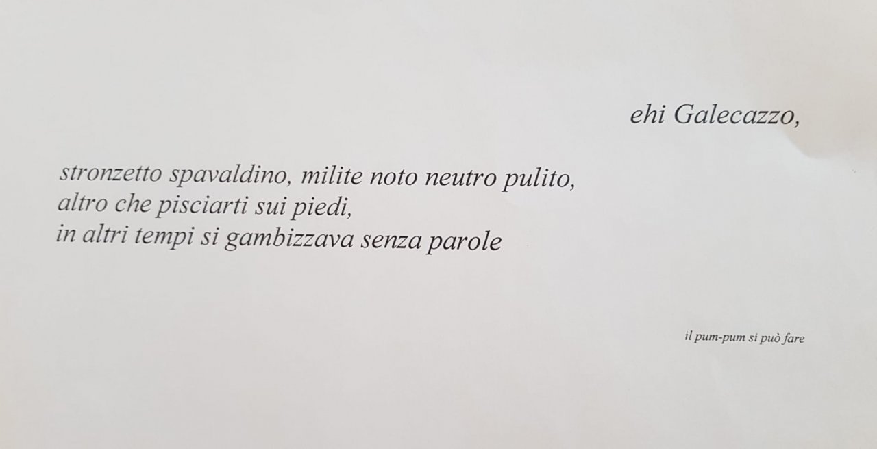La missiva, condivisa su Facebook dallo stesso consigliere comunale luganese (vedi sotto), riporta svariati insulti e la minaccia «di gambizzare senza parole» che riporta a un oscuro passato non troppo lontano. «L’artista si è impegnato a scriverla con il pc, peccato che non abbia avuto le palle di firmarla», scrive un arrabbiato Galeazzi, precisando che benché l’idea di fare una denuncia penale contro gli ignoti al Ministero pubblico gli sia balenata in mente, «non vale la pena spendere i soldi dei contribuenti per queste persone». «Firmate l’iniziativa e diamo loro una risposta democratica alle urne»