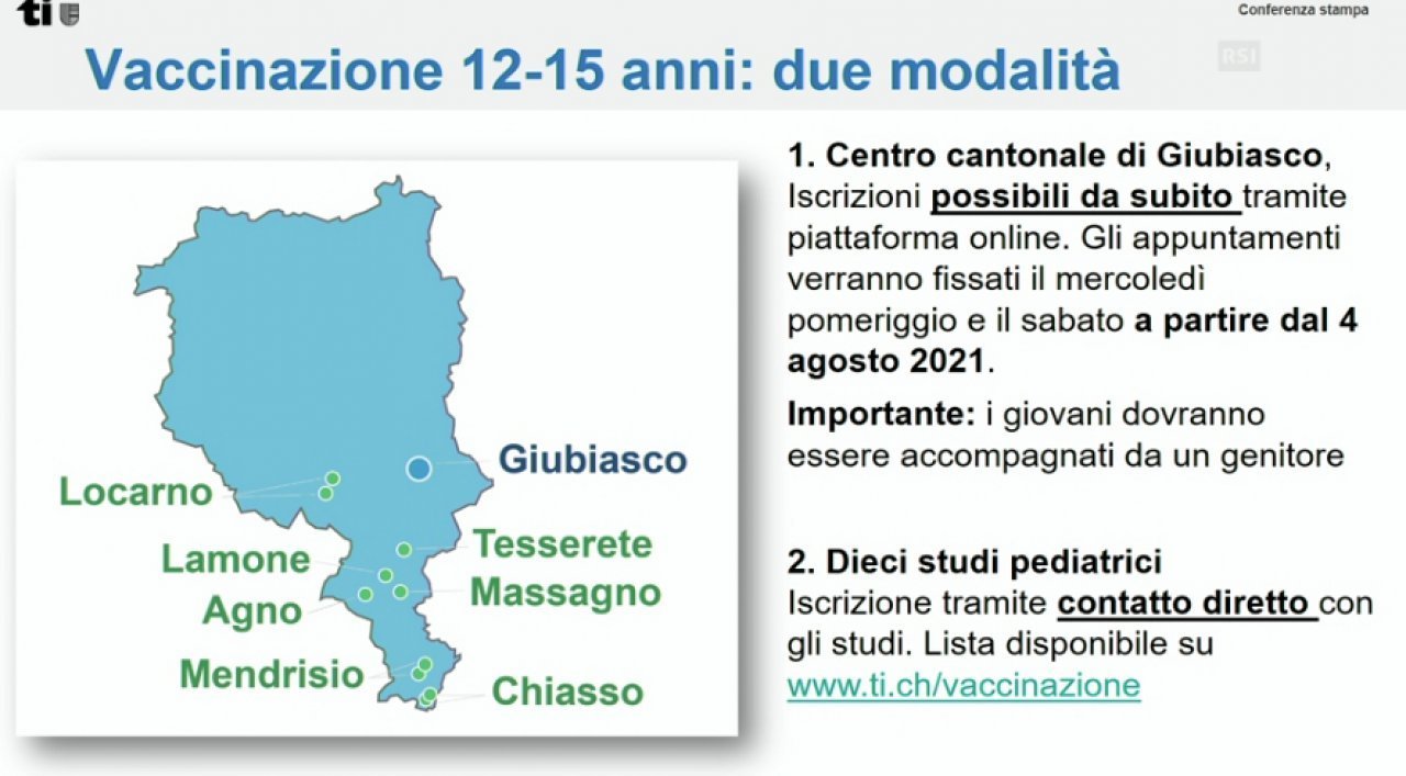 Zanini: In questa fase si aprono le vaccinazioni agli adolescenti. Questo, secondo due modalità. In tutti i casi deve essere utilizzato il vaccino della ditta Pfizer, l'unico preparato omologato da Swissmedic per questa fascia d'età. La vaccinazione è possibile solo al centro vaccinale di Giubiasco, e le iscrizioni sono aperte online da adesso. I primi appuntamenti verranno attribuiti il 4 di agosto. Abbiamo predisposto delle fasce temporali, il mercoledì pomeriggio e il sabato, riservate a questa fascia di popolazione, per rendere gli appuntamenti compatibili con gli impegni scolastici. I ragazzi, è stato stabilito, devono presentarsi accompagnati da almeno un genitore. Più avanti sarà inoltre possibile vaccinarsi anche in 10 studi medici selezionati.