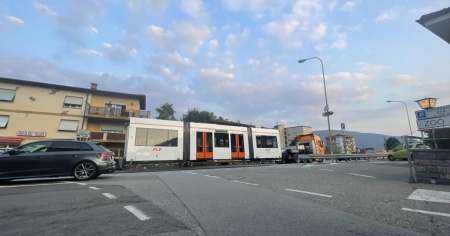 Uno dei nuovi convogli delle FLP, che manderanno in pensione i mitici trenini del '78, è stato notato oggi in quel di Magliaso. Ma non viaggiava su rotaie, bensì su gomma. Il perché del "trasloco" non è noto, ma con buone probabilità è uno dei nuovi elementi che andranno a comporre il rinnovato parco treni delle FLP.