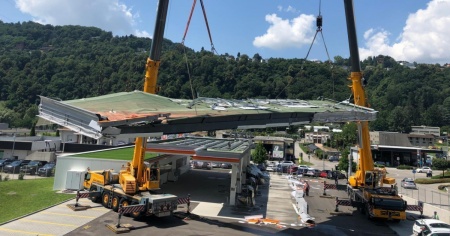Spettacolari le immagini dello spostamento del tetto della stazione di benzina Coop nell’adiacente parcheggio.