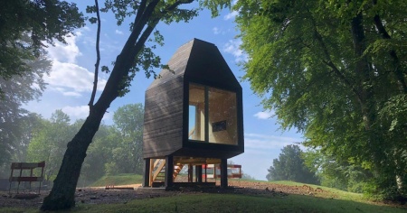 La struttura, chiamata "Momò Bellavista", è immersa nel bosco e concepita per trasformarsi in un osservatorio sul cielo.
