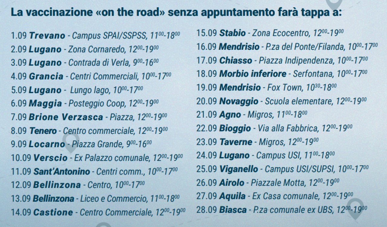 Le varie tappe comprendono zone con forti afflussi quotidiani di lavoratori e studenti, come pure località discoste. L'obiettivo è di effettuare un centinaio d'inoculazioni al giorno, per un totale di quasi tremila.