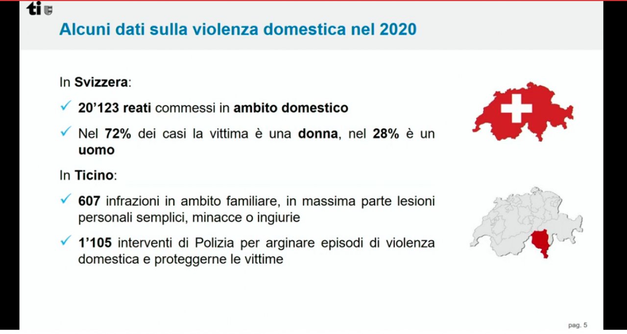 Tre interventi al giorno in Ticino - Benché molti casi restino ancora sommersi, i dati relativi al 2020 sono infatti impressionanti sia a livello nazionale che ticinese. «In Svizzera ci sono stati 20'123 reati in ambito domestico», elenca il Direttore del DECS. «Nel nostro cantone abbiamo invece registrato 607 infrazioni in ambito familiare e più di mille interventi di polizia. In pratica tre interventi al giorno. Questo ci dà la dimensione del fenomeno».