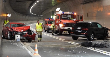 Quest’ultima è stata realizzata nel mese di giugno 2021 tramite strisce strutturate e frecce sulla pavimentazione. Grazie allo “strato rumoroso”, questa segnaletica particolarmente efficiente, è in grado di riportare l’attenzione del conducente sulla strada in caso di leggera perdita di controllo del veicolo. Nel mese di luglio 2021 sono stati installati due pannelli informativi aventi lo scopo di avvisare lungo le zone di approccio del passaggio da due corsie per direzione a una galleria bidirezionale. La rimanente misura consigliata, segnali lampeggianti LED indicanti il traffico in senso inverso, è stata concretizzata all’inizio di dicembre 2021.