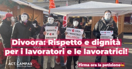Così, incalzano i sindacati, dal 1° novembre 2021. «Non è bastata la voce dei lavoratori levatasi in piazza Riforma a Lugano il 23 dicembre scorso per denunciare quanto stesse accadendo, affinché i dirigenti dell’azienda uscissero dalla loro bolla per avere un serio e reale confronto con chi permette loro di fare profitti. Adesso, al loro grido si sono unite 1’400 persone che, sostenendo le rivendicazioni dei driver Divoora, chiedono all’azienda di riconoscere dignità, un giusto salario e condizioni di lavoro giuste a suoi dipendenti».
