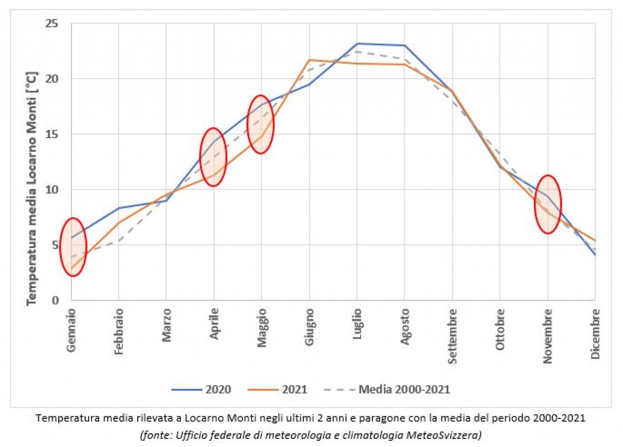 Il freddo tra le cause - Qualche utente grida all’errore puntando il dito contro la lettura del contatore. Per la SES, invece, «questo aumento è riconducibile principalmente alle temperature particolarmente fredde» nei mesi di gennaio, aprile maggio e novembre 2021 (vedi grafico qui sotto). Temperature che «hanno intensificato l’utilizzo dei sistemi di riscaldamento (soprattutto riscaldamenti elettrici e termopompe)».