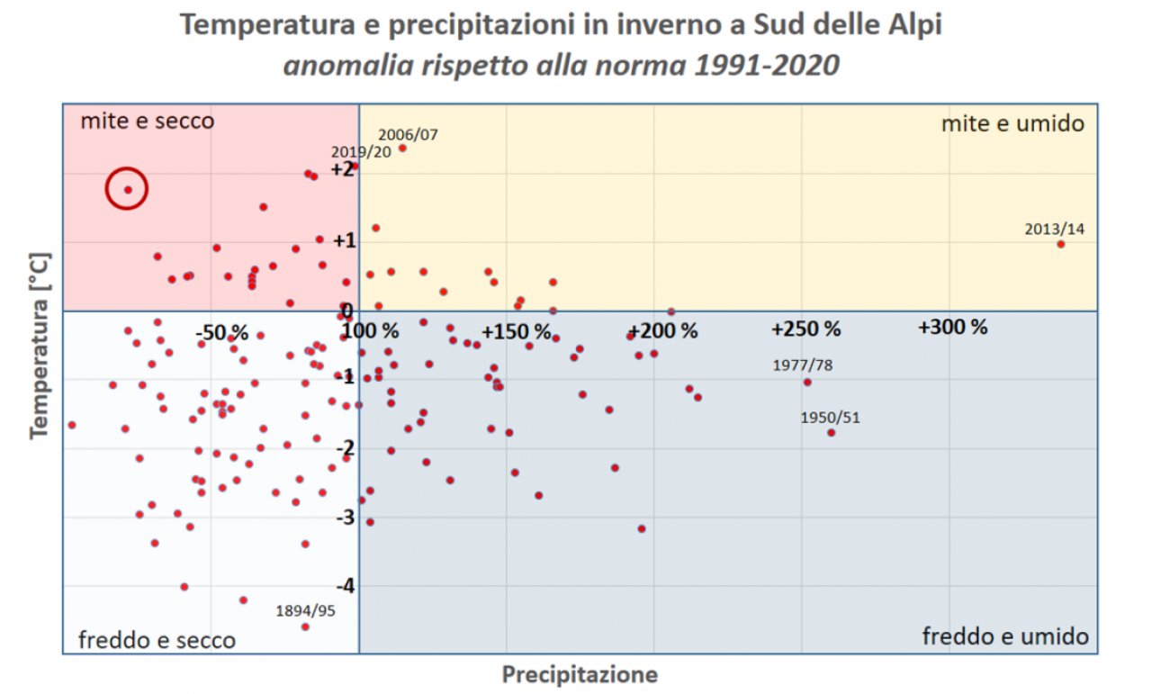 Come appare chiaramente dal grafico, in passato non si era mai verificato un inverno con una temperatura media superiore alla norma di 1°C e precipitazioni inferiori alla metà di quelle attese. Questo si è tuttavia verificato durante la stagione invernale che volge al termine, a causa principalmente di due fattori: condizioni anticicloniche persistenti caratterizzate da aria molto mite in quota, che ha contribuito a far registrare temperature miti soprattutto in montagna, e frequenti giornate con favonio, che hanno innalzato le temperature anche alle basse quote.