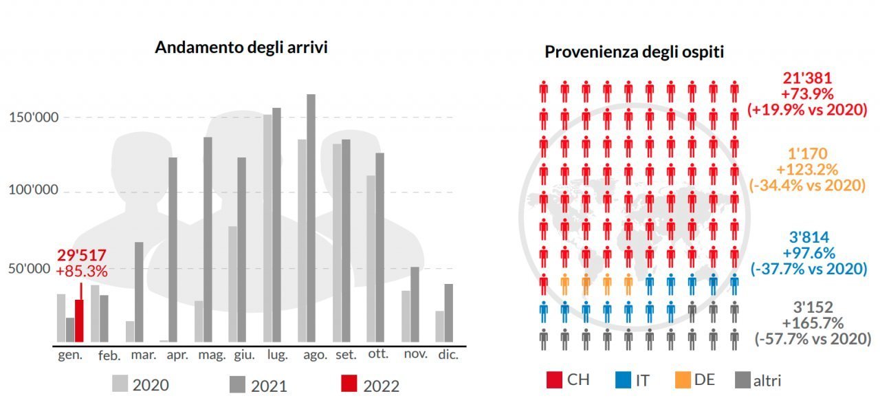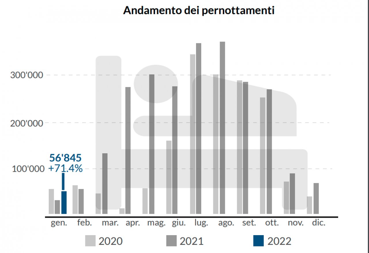 Ticino Nel suo piccolo anche il Ticino, cantone che notoriamente non fa della stagione invernale il suo punto di forza, ha fatto registrare ottimi numeri nel primo mese dell'anno. I pernottamenti di gennaio - come riferito dall'Osservatorio del Turismo (OTur) dell'USI (si veda il grafico sottostante) - hanno infatti toccato quota 56'845 (+71,4% rispetto a dodici mesi prima). Questo dato resta però più basso (-10,1%) se paragonato a quello di gennaio 2020, quando la pandemia non era ancora scoppiata.