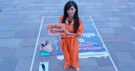 COMO - Quattro strisce di nastro adesivo ricreano un perimetro di tre metri per due sulla pavimentazione in porfido di Piazza Verdi a Como, appena alle spalle del Duomo e di fronte al Teatro Sociale. Le ha posate una ragazza che, una volta completati i preparativi, si scioglie i capelli neri e lucenti, che il vento insolitamente caldo del pomeriggio le scompiglia, e indossa una tuta arancione, che le sta larghissima. «Una L, l’unica che avevano, mia mamma mi ha aiutato a ridurla un po’». In questo modo Lorena Corrias si trasforma, anche se per sole due ore, nel simulacro di un recluso delle prigioni “speciali”, come Guantanamo. Mentre quella manciata di metri quadri è esattamente lo spazio a disposizione, da oltre 1200 giorni, di Julian Assange nel penitenziario di Belmarsh, che non a caso è stato ribattezzato la "Guantanamo britannica".