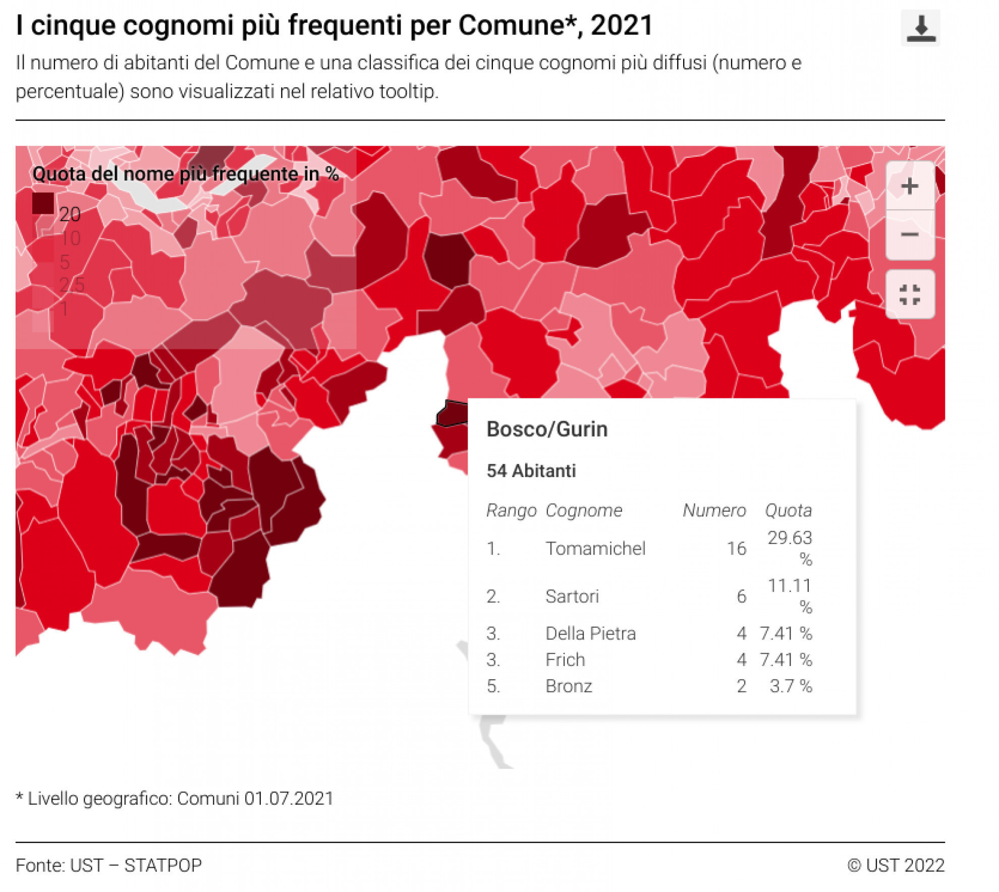 Quando comune e cognome vanno di pari passo - Per quanto riguarda invece i comuni, quelli con la quota di rappresentazione maggiore del cognome più diffuso sono Bosco Gurin, con il 29,63% degli abitanti di cognome Tomamichel, Cerentino, con un 27,78% di Beroggi, Linescio, con un 14,63% di Moretti, Bedretto, con un 13,86% di Leonardi e Campo Vallemaggia, con un 13,46% di Gobbi.
