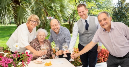 La signora Elisabeth Adamina con i familiari, il Municipale Bruno Buzzini e il direttore della Residenza al Lido Gabriele Wüthrich.