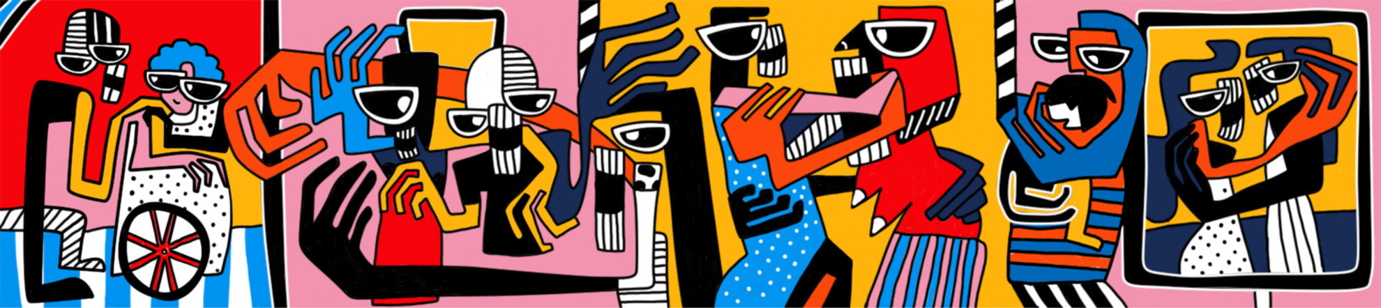 NSN997 è il nome della crew nata in provincia di Napoli nel 1997 composta da tre ragazzi con la passione per la cultura hip-hop. Dopo gli studi in illustrazione, grafica e web design le loro strade si separano, per poi ricongiungersi a Madrid a partire dal 2014, quando iniziano un nuovo percorso artistico comune che nel 2017 sfocia nello sviluppo del loro “Positive Pattern”: un pattern figurativo che rappresenta un’idea di società positiva e coesa.