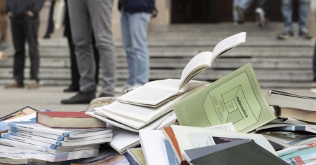 «È un'azione di protesta creata da noi docenti e aperta a tutti i docenti», ha spiegato a Tio/20 Minuti la docente di Arti Visive al Liceo di Lugano 1, Miriam Siragusa, che ha ideato la performance, partita da un’installazione (un cerchio di dieci metri composto da vecchi libri che andavano comunque buttati) e da una scritta: «Diritto all’istruzione per tutti i nostri figli».