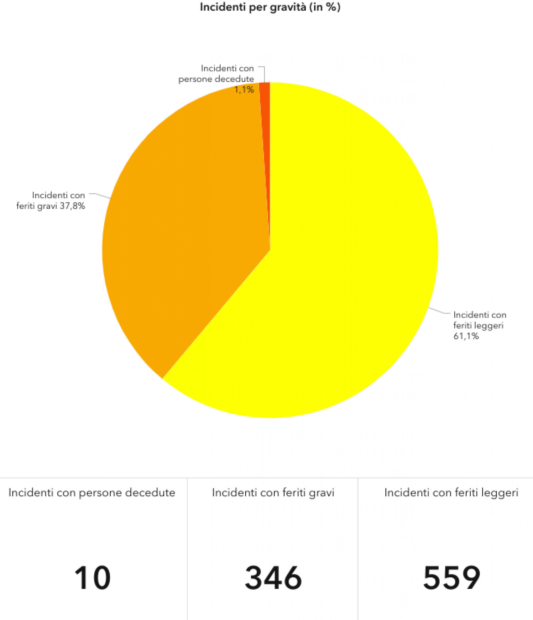 Nello specifico, sono stati 551 gli incidenti con feriti lievi e 346 con feriti gravi. Si sono registrati, invece, 10 decessi.