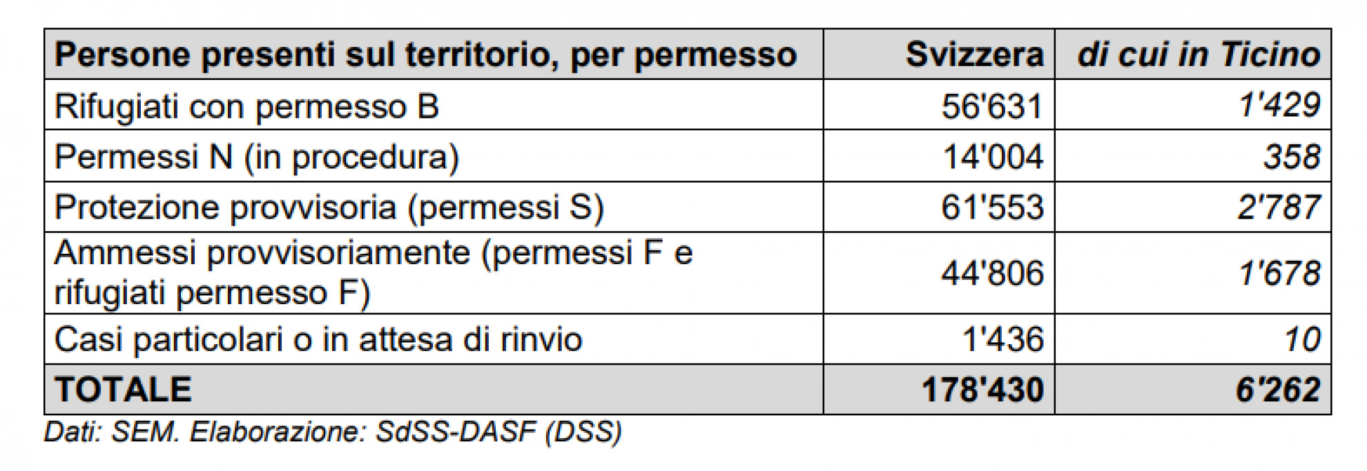 Per quanto riguarda la situazione attuale, al 30 novembre dello scorso anno in Ticino, «erano registrate dalla Segreteria di Stato della migrazione 6’262 persone, di cui 2'787 in possesso della protezione provvisoria (permesso S), 1'678 ammesse provvisoriamente