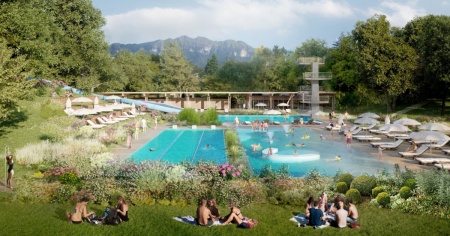 La piscina viene ripartita in tre vasche - La grande piscina attuale (che oggi non è conforme alle caratteristiche che esigono le competizioni) sarà ripartita in 3 vasche: una dedicata ai tuffi e ai nuovi scivoli, una per i nuotatori con tre corsie lunghe 25 metri e infine l'ultima per lo svago e il relax con sedute e giochi d'acqua. Anche le vasche esistenti per i più piccoli saranno rinnovate e si prevede la formazione di una nuova area giochi che sarà fruibile tutto l'anno. Gli spazi esterni saranno riqualificati con l'inserimento di aree verdi e percorsi pedonali.