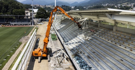 LUGANO - Questa mattina le ruspe sono entrate in azione per demolire la ”vecchia” Tribuna Monte Brè dello Stadio di Cornaredo. Un luogo che nei cuori di molti tifosi evoca ricordi importanti, di imprese e di sofferenze.