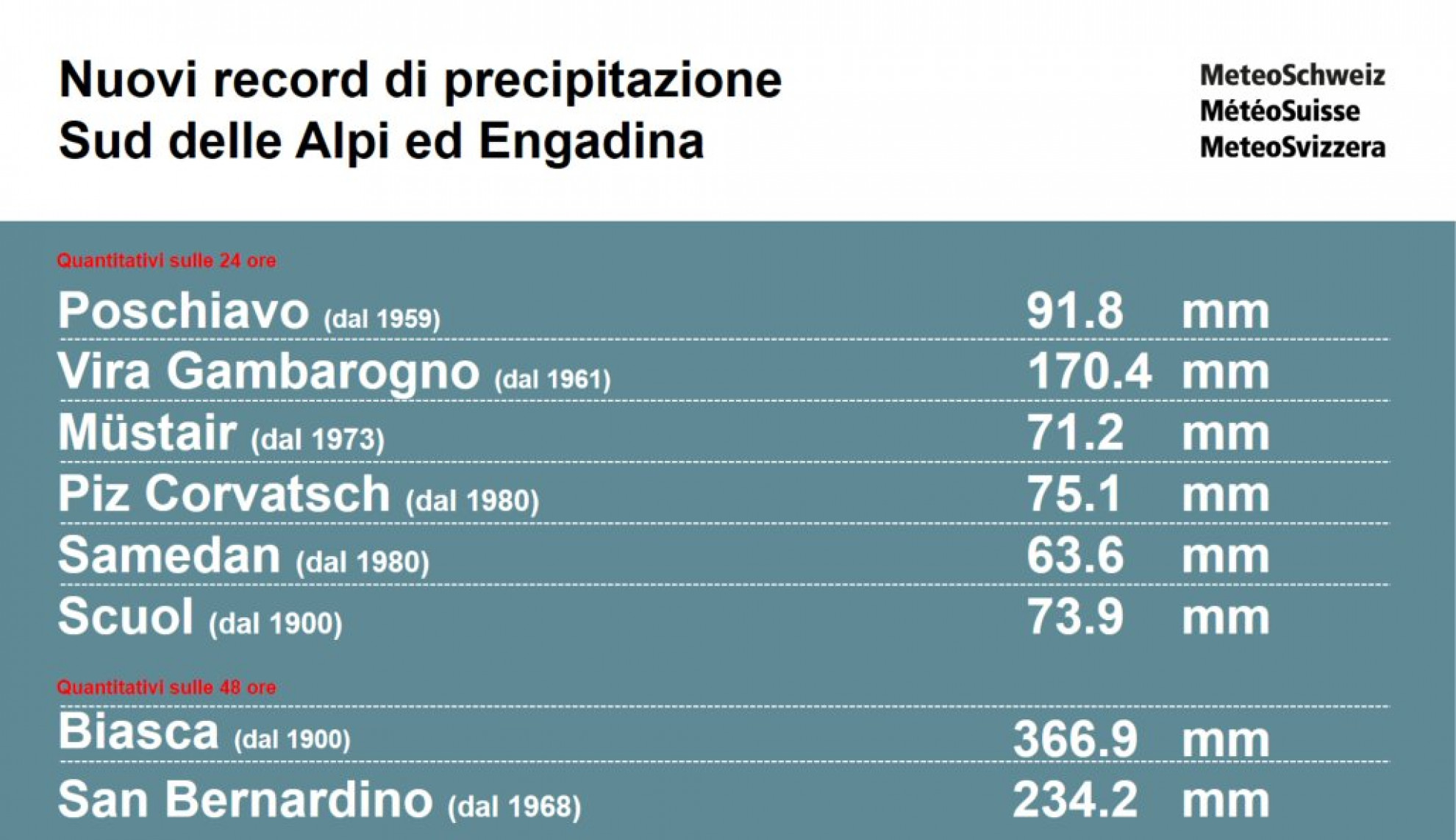 Precipitazioni da record - D'altronde, come fatto notare da MeteoSvizzera sul suo blog, le precipitazioni registrate in questi giorni hanno fatto registrare dei nuovi record. Anche in località (come Biasca) dove le misurazioni sistematiche sono iniziate nel 1900. «Nell'arco di 48 ore sono stati registrati tra 120 e 250 millimetri di pioggia. Gli accumuli maggiori sono stati registrati nella fascia compresa tra il Locarnese, la Bassa Vallemaggia, la Valle Verzasca, la Riviera e la Bassa Valle di Blenio, dove sono caduti 200-300 mm, tra le Centovalli e la media Verzasca come pure in Riviera localmente fino a 370 mm».