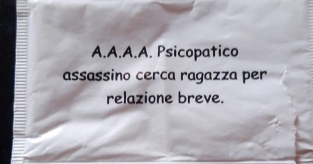 Un umorismo da bar, verrebbe proprio da dire, quello stampato sui piccoli involucri di carta, ritenuto addirittura agghiacciante dalle due. Ma è soprattutto il"A.A.A.A. Psicopatico assassino cerca ragazza per relazione breve", ad aver fatto andare di traverso il caffè alle co-presidenti.