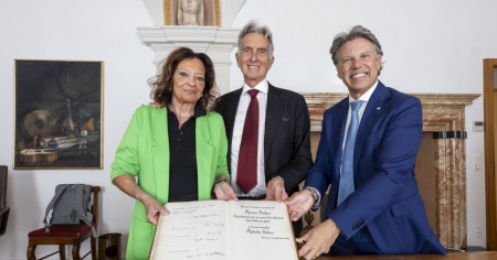 Il libro "d'oro" di Locarno - Del metallo prezioso, da cui trae il suo nome, il Libro d’oro di Locarno non ha nulla: ha le dimensioni di un foglio A4 (21 x 29 cm circa), una copertina finemente lavorata in pelle marrone, le delicate pagine riempite di inchiostro nero o blu, e ovviamente l’odore di un buon libro. Il suo nome, dunque, simboleggia il valore del suo contenuto. Ogni pagina viene accuratamente preparata con grande anticipo, collaborando con le suore del Monastero delle Carmelitane Scalze di Locarno che, con sapiente manualità, abilità e delicatezza scrivono a mano in una speciale calligrafia il nome e il ruolo di colei o colui che firmerà il Libro d’oro. Il libro custodisce nomi e pensieri di oltre cento personalità illustri in visita in Città, dai reali di Svezia fino al già presidente della Confederazione Ignazio Cassis, passando per diversi esponenti del Corpo diplomatico, imprenditori, autorità religiose, politici di livello cantonale, nazionale, internazionale e molti altri. E ora, il prezioso libro contiene anche la