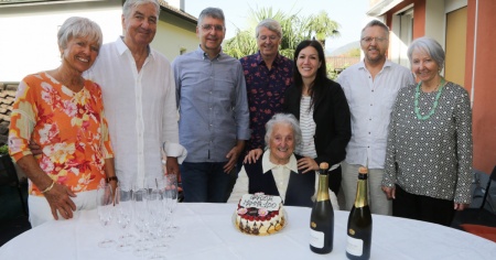 E la festa è stata inoltre arricchita da un ulteriore graditissimo “regalo”. Tra i desideri della centenaria, infatti, v’era quello di ricevere gli auguri da parte del Sindaco, Alain Scherrer. Purtroppo impossibilitato a presenziare fisicamente, il Sindaco ha comunque risposto presente, inviandole un videomessaggio di auguri, che la festeggiata ha dimostrato di aver davvero gradito. Un videomessaggio, nel quale il Sindaco si è complimentato con la signora per aver cresciuto una bella famiglia numerosa e anche per i sorrisi e la gioia che ha regalato nel corso degli anni a molte spose. La signora Canonica, infatti, per lungo tempo si è dedicata alla sartoria – oltre che alla famiglia – confezionando splendidi abiti da matrimonio. Infine, ultimo assist per il Sindaco, che come noto è appassionato di musica e cantante, è stato ricordare l’eccellente luogo d’origine della festeggiata, Granaglione, posto nell'Appennino bolognese a pochi chilometri di distanza da Pavana, dove abita Francesco Guccini, e da Zocca, luogo di residenza di un altro cantante assai apprezzato anche a Locarno, Vasco Rossi.