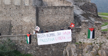 Striscione a Bellinzona contro le bombe su Gaza
