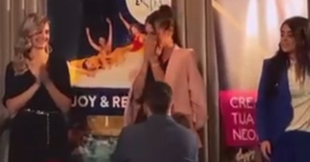 Visibilmente commossa, la ragazza ha baciato il suo futuro marito. Il fatidico momento è stato ripreso dai presenti.