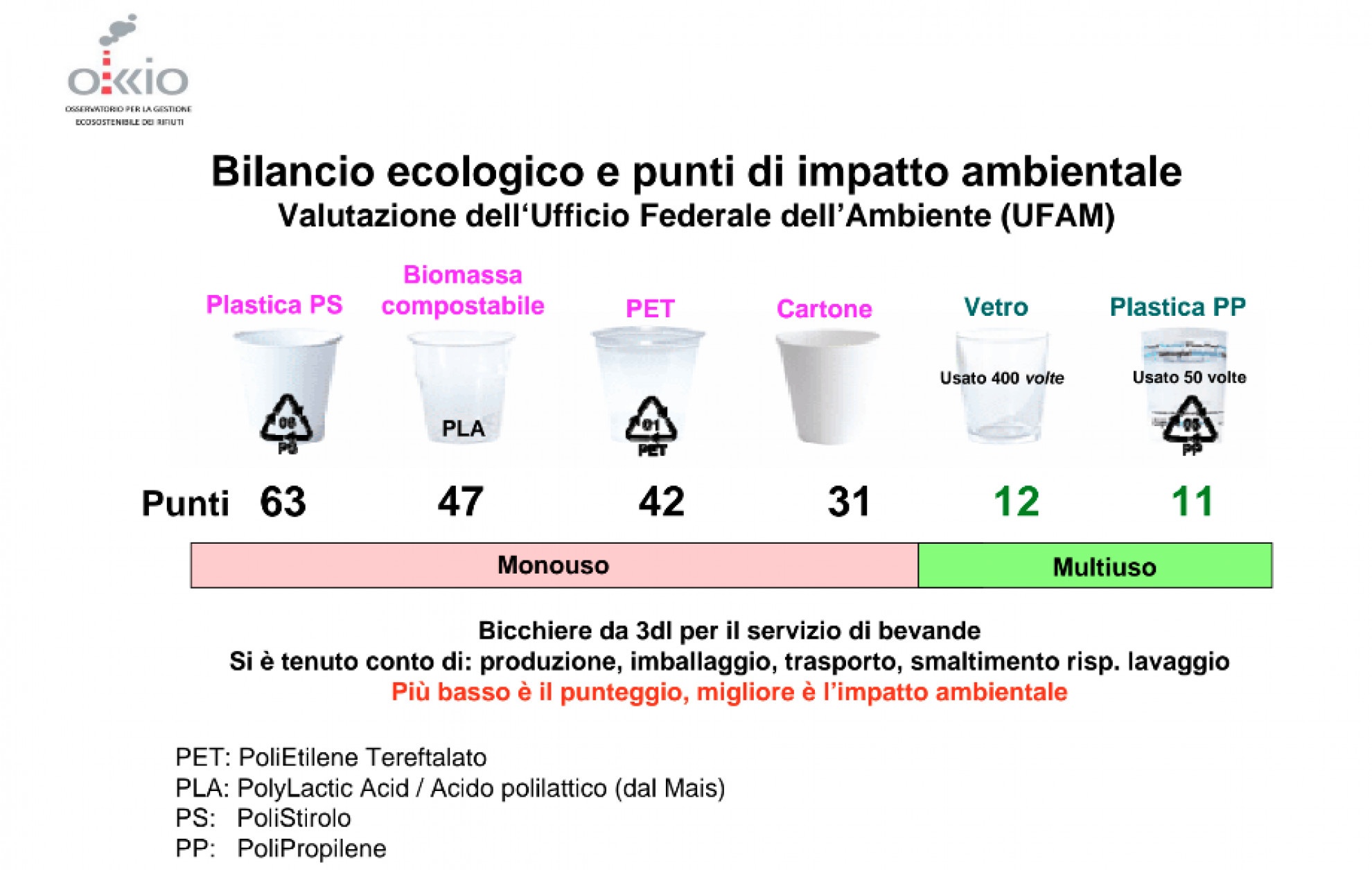 OKKIOL'impietoso confronto tra gli impatti ambientali dei bicchieri monouso e multiuso.