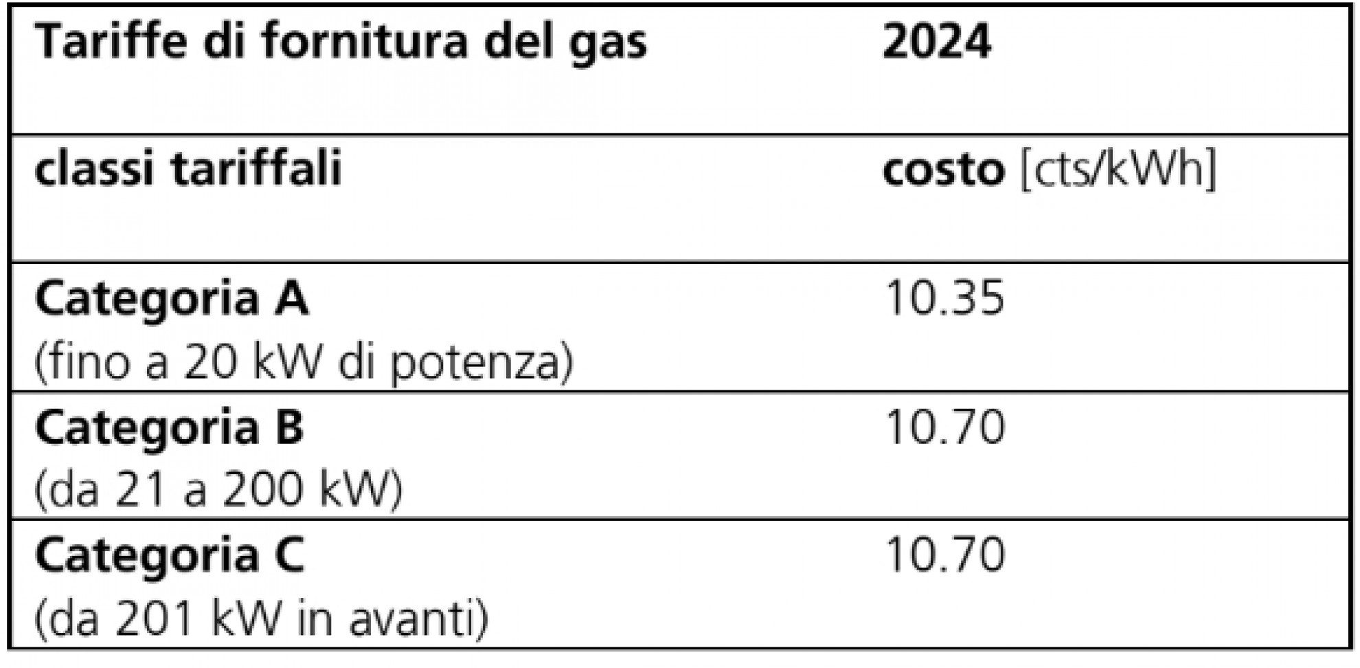 Concretamente significa che una casa monofamiliare media di cinque locali con un consumo annuo di 25'000 kWh di gas per riscaldamento con un bruciatore della potenza media di 15 kW (appartenente alla classe tariffale Categoria A) il costo indicativo annuo è di 2'767 franchi. Ciò corrisponde a circa CHF 150 franchi in meno rispetto al 2023.