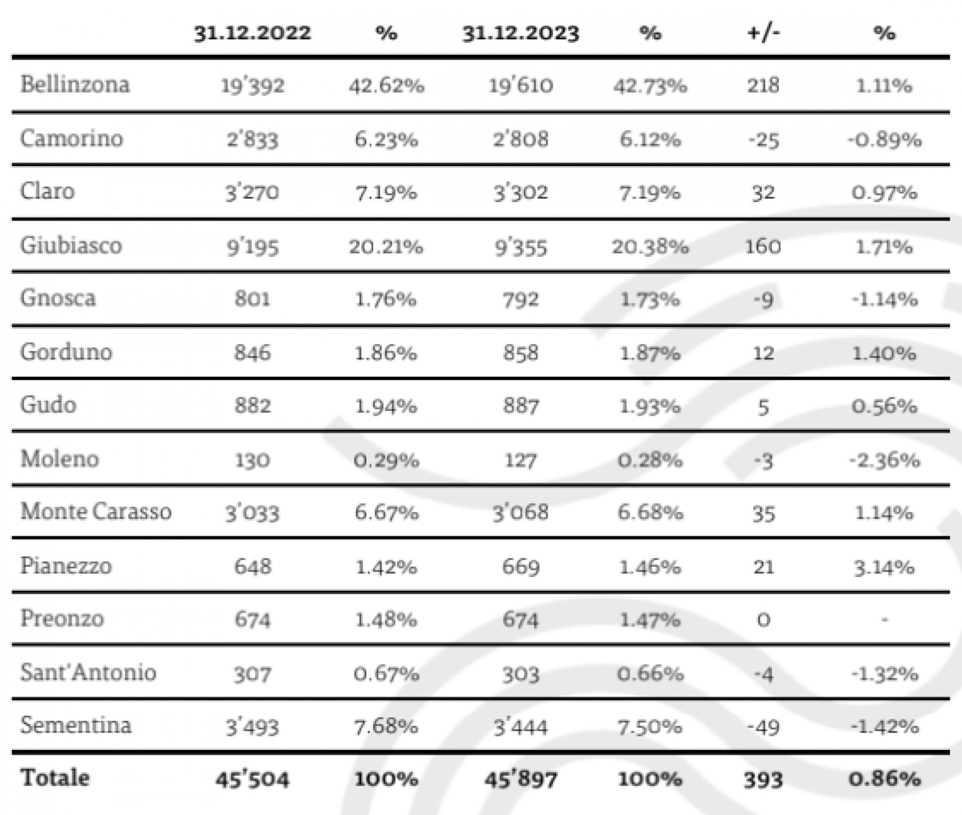 La "Grande Bellinzona" sfiora ora i 46'000 abitanti. Dall'aggregazione si è registrato un +5,7%.