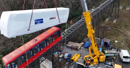 PARADISO - Nel prosieguo dei lavori di rinnovo, è arrivata a Paradiso anche la seconda nuova vettura della funicolare del San Salvatore, posata sul viadotto di Calprino.