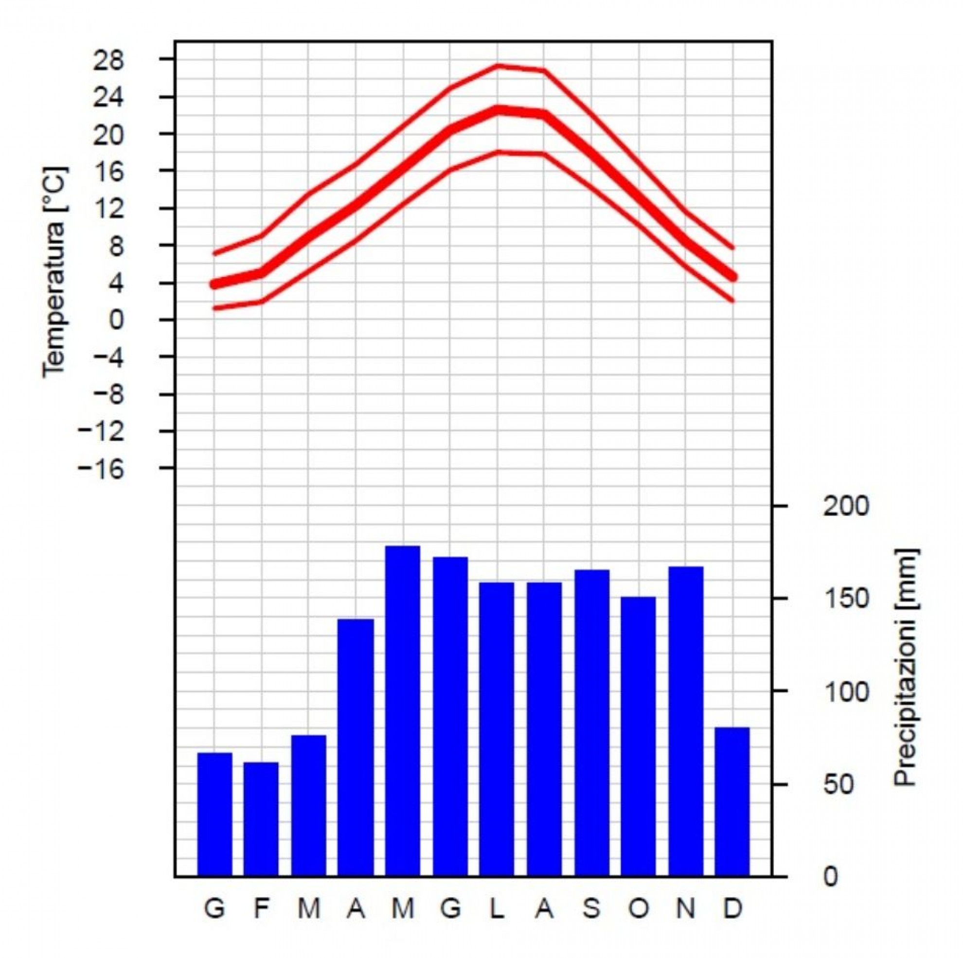 MeteoSvizzeraValori climatologici per Lugano, temperatura e precipitazioni mensili (norma 1991-2020). Come si può notare i mesi invernali sono i più avari di precipitazioni.