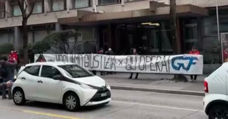 Le persone, infatti, reggono uno striscione recante la scritta «Vogliamo giustizia per gli operai» e il nome dell’azienda: il riferimento è alle presunte irregolarità evidenziate dai lavoratori, supportati dal sindacato, nel cantiere AlpTransit della galleria del Monte Ceneri.