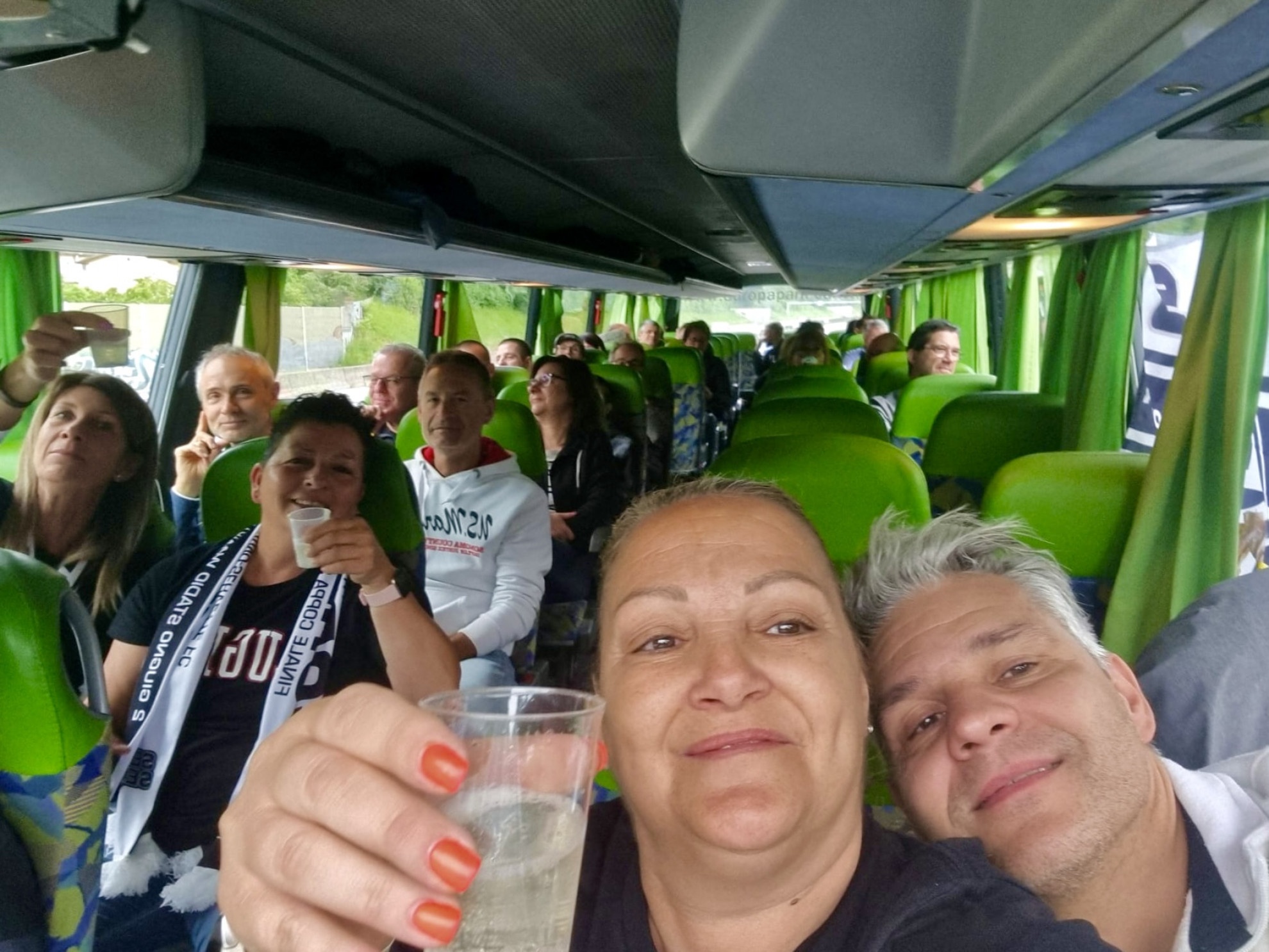 Moira di Riva San Vitale (col bicchiere) sul bus con gli amici del "suo" Fans Club.